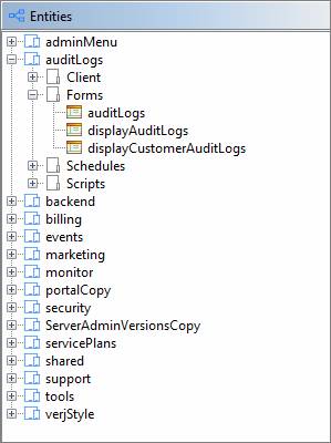 The studio tree is initially displayed on the left-hand side of the studio window, but it can be dragged to other locations if required. The tree shows all projects, folders, entities and other files that exist in the workspace. Double-click on an item in the tree to open it.