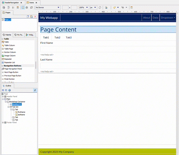 Each form page can optionally be surrounded by 4 Java Server Pages (JSPs) or HTML pages corresponding to top, left, right and bottom of the page. These are commonly used to include content that is common to all pages of a form e.g. company name, logo, images etc. These JSPs can access the form’s state data – fields, tables, pages etc, so it is also possible to create panels containing navigation menus etc.